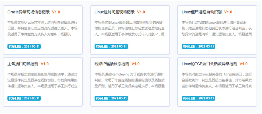 場(chǎng)景化, 圍繞運(yùn)維場(chǎng)景來分類管理, 支持用戶自定義場(chǎng)景,不斷優(yōu)化、補(bǔ)充不同的場(chǎng)景,輔以智能、自動(dòng),減少繁重運(yùn)維壓力、標(biāo)準(zhǔn)化執(zhí)行、可靠無差錯(cuò)執(zhí)行運(yùn)維工作