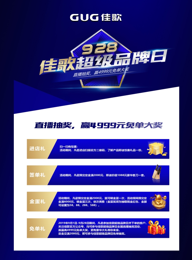 免單禮:2019年9月1日至9月28日期間,凡是參加佳歌超級品牌日并下單的客戶,關(guān)注佳歌官方公眾號,均可參與佳歌超級品牌日全國直播抽獎活動,贏最高4999元免單大獎,更有豪華大禮等你來拿。定金交滿2000元,即可參與超級品牌日免單抽獎。