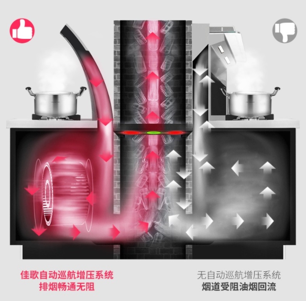 除此之外,佳歌集成灶還采用自動(dòng)巡航增壓科技,通過(guò)檢測(cè)和增壓的實(shí)時(shí)聯(lián)動(dòng),保證自己的煙機(jī)排風(fēng)壓高于公共煙道以及別人的排風(fēng)壓。超過(guò)420pa的排風(fēng)壓遠(yuǎn)高于公共煙道內(nèi)的高峰風(fēng)壓,確保順暢排煙。