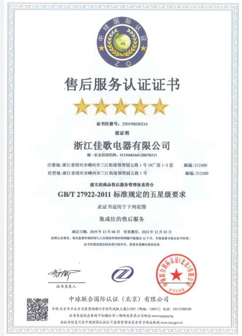 售后服務五星級認證證書