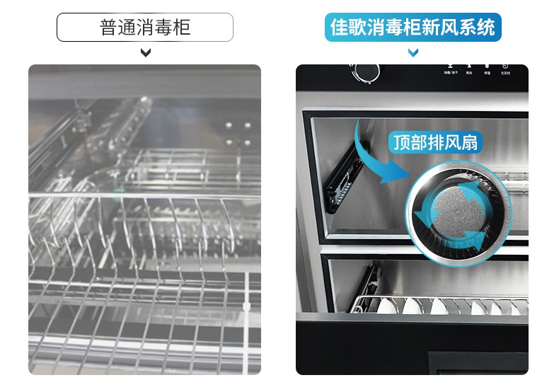 佳歌所有消毒柜款集成灶都搭載有新風(fēng)系統(tǒng)。消毒柜頂部均有配備排風(fēng)扇,消毒烘干結(jié)束自動開啟30分鐘排氣,排出柜內(nèi)水蒸氣,消除臭氧異味。讓所有使用者打開柜門永遠(yuǎn)都是清新空氣。