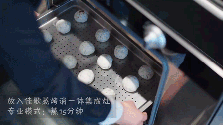 4. 將青團(tuán)放入佳歌蒸烤消一體集成灶,專業(yè)模式下100℃蒸制15分鐘即可。佳歌蒸烤一體集成灶采用蒸汽發(fā)射器直噴速熱,高速直噴蒸汽迅速滲透食物,蒸得快又透。