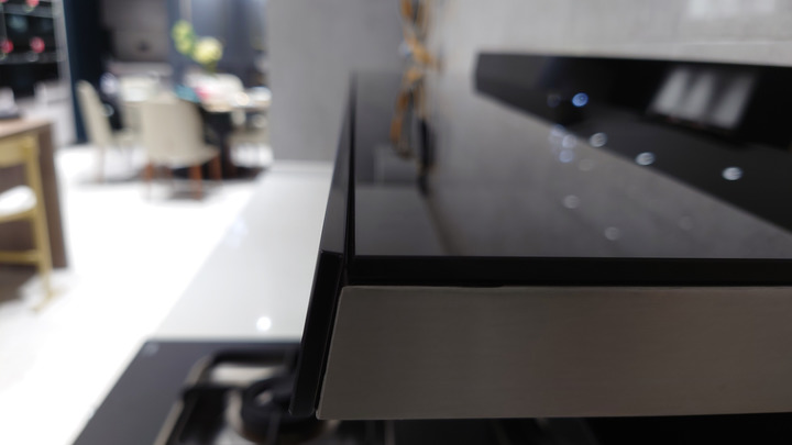 由國(guó)內(nèi)知名設(shè)計(jì)公司洛可可參與設(shè)計(jì)的劉海屏煙機(jī)頭,無疑是整個(gè)集成灶的C位,槍灰色拉絲紋理的斜面,看上去充滿高級(jí)感。