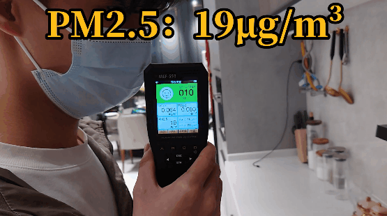 使用空氣檢測(cè)儀測(cè)試鼻子附近的空氣質(zhì)量,可見人臉處基本沒有受到濃煙污染,下方油鍋則污染嚴(yán)重,證明煙霧完全被控制在攏煙區(qū)域內(nèi)。