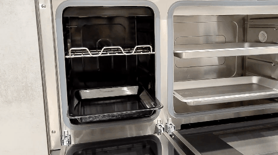 兩個(gè)箱體的頂部和底部均安有發(fā)熱管,烤箱的頂部還額外增加了循環(huán)風(fēng)扇,使熱量分布更加均勻。市面上的普通蒸、烤箱通常只配有頂部加熱管,加熱均勻度相比之下會(huì)略遜一籌。