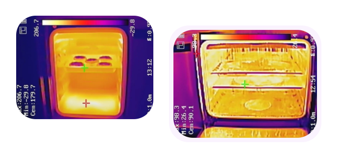 分體蒸烤的效率很高,半小時(shí)不到兩邊都完成了烹飪。打開箱門,通過熱成像圖可看到烤箱的底部熱管也有參與烹飪,因此腔體溫度非常均勻。
